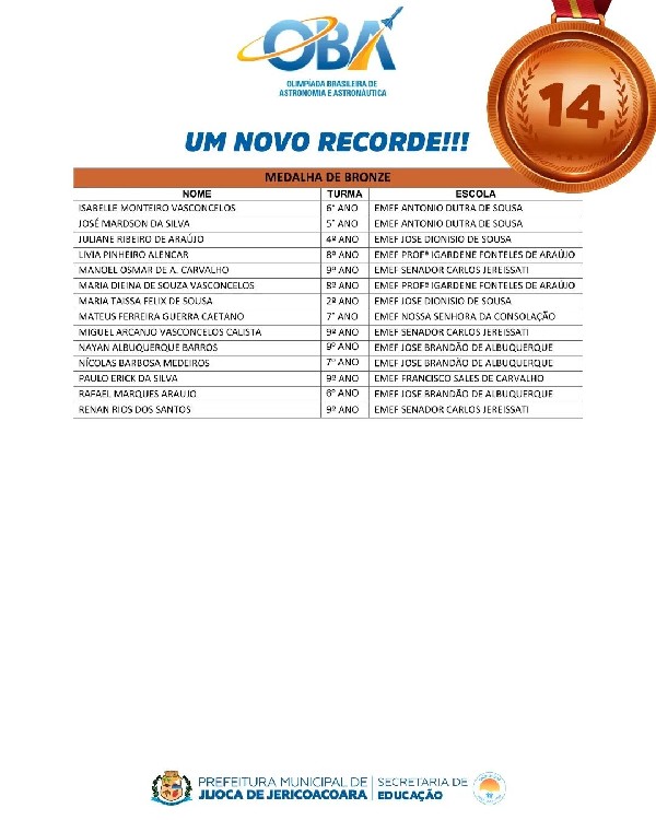 A Rede Municipal de Ensino de Jijoca de Jericoacoara conquista 139 medalhas na *Olimpíada Brasileira de Astronomia e Astronáutica - OBA 2022*.