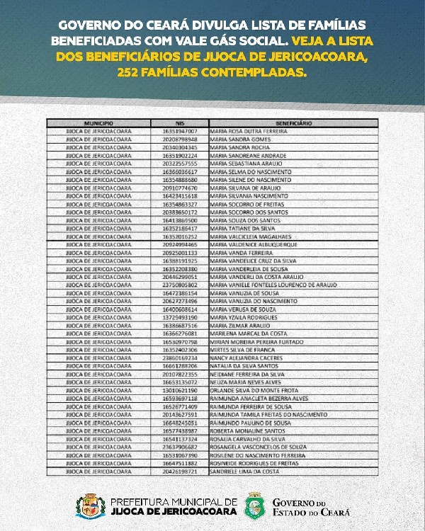 O Governo do Ceará divulgou a lista com as famílias beneficiadas pelo programa Vale Gás Social. Veja nas imagens a lista lista com os nomes dos beneficiários. A previsão de entrega ao nosso município será para a próxima semana.